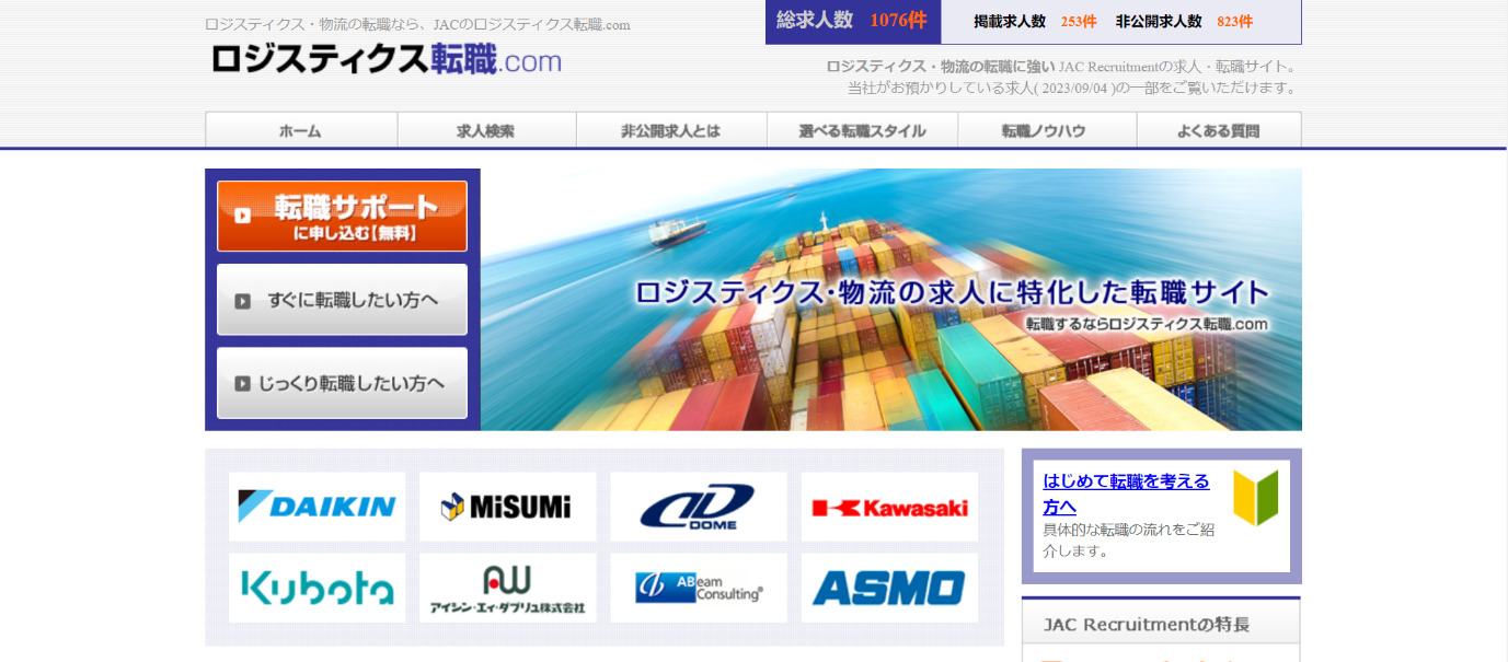 世界12か国に拠点を持ちグローバル企業・海外案件に強みを持つ転職エージェントJAC Recruitmentが運営するロジスティクス・物流分野に特化した転職支援サービスです。ハイクラス求人を中心に物流、製造業、ITなど幅広い業界の物流関連職種を取り扱っており、求人サイトには出回らない非公開求人を多く保有しています。豊富な求人数と異なる専門性を持つ300名超のコンサルタントが在籍しており、求職者様に沿った転職支援を行っています。
